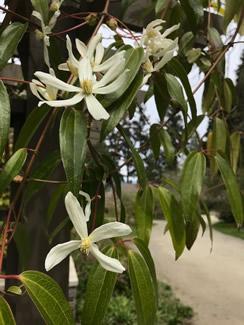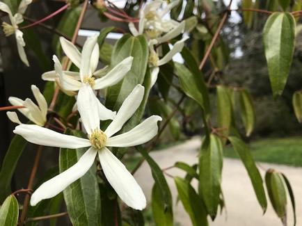 The Evergreen Clematis can be found on the Gardeners Cottage arbour at Milner Gardens & Woodland.