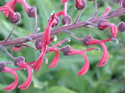 Lobelia tupa, a native of Chile, is a robust, upright, clump forming perennial. The stems are red-purple and the leaves lance shaped, downy and grey-green. The flowers are narrowly tubular, two-lipped in shades of brick red. These are borne on long racemes, above tall stems from mid-summer to mid-fall.