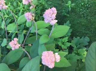 Large, fuzzy, pointed leaves in spring are followed by pink little bud bundles in mid-summer - a precursor to the multitude of elegant lace cap flowers of violet, white, and blue which decorate the plant from late summer into autumn - a "violet blue that hums at dusk", Pearson notes.